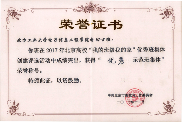 近日,2017年北京高校“我的班级我的家”优秀班集体创建评选活动在北京工业大学举行,beat365电信学院电14-5班在全市百余个参赛班集体中脱颖而出,荣获2017年北京高校“优秀示范班集体”荣誉称号。十年寒窗苦争渡,群英荟萃晋元路跨别高中,挥别父母,35名同学集合在北京美丽的西山脚下,这里钟灵毓秀,风光怡然。日月交替,夏秋轮回,这里是梦开始的地方。beat365官方网站电子信息工程学院电14-5班组建于2014年9月,共有35人,其中党...