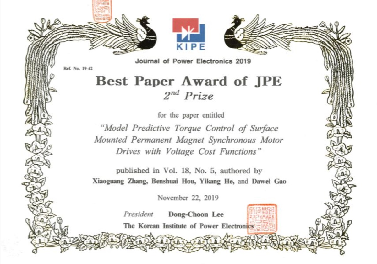 近日,从韩国电力电子学会KIPE (The Korean Institute of Power Electronics)获悉,beat365电气与控制工程学院教师张晓光于2018年在国际学术期刊Journal of Power Electronics发表的论文“Model Predictive Torque Control of Surface Mounted Permanent Magnet Synchronous Motor Drives with Voltage Cost Functions”(第18卷5期)被评为该期刊2019年度最佳论文。Journal of Power Electronics期刊由韩国电力电子学会主办,是SCI...