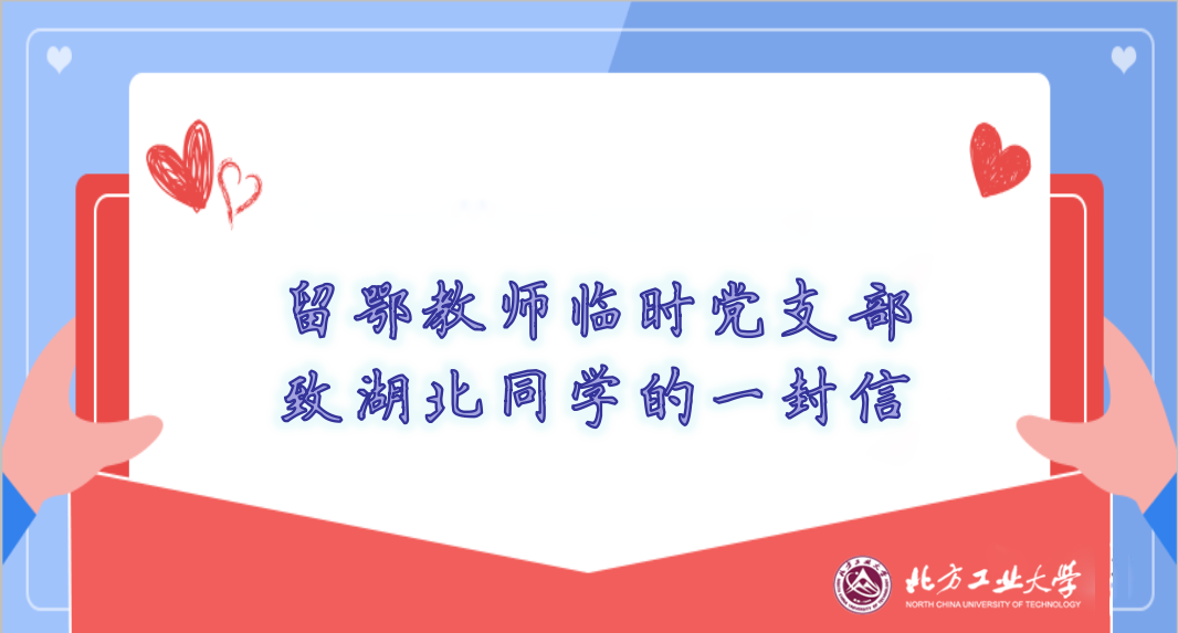 亲爱的同学们: 大家好!作为beat365官方网站的学子,往年此时,正是大家在校园里“吟诗观书涛,静待玉兰开”的惬意时光。然而,这一切都被新冠疫情打乱了,我们经历了一个特殊的春节,经历着一场与病毒的生死较量。北方工大留鄂教师临时党支部的老师们跟你们一样,此时此刻正身处新冠肺炎疫情防控的主战场,我们都是这场战“疫”的亲历者、参与者、见证者。