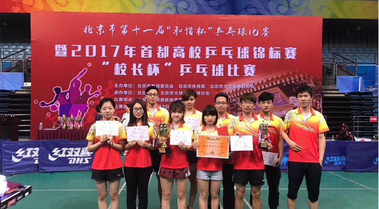 6月4日至5日,由北京市教育委员会、北京市体育局主办,北京市大学生体育协会乒乓球分会、北京大学承办的2017年首都高校乒乓球锦标赛在北京大学邱德拔体育馆举行。本届比赛共有70所院校和单位,118支代表队,运动员达600多人。 以刘帅、姜伟民、高歌、杨评新、徐遨蓝组成的男子代表队和以郑悦、王睿文、刘雅清、郭利娜、王曼组成的女子代表队, 在教练团队的带领下,经过2天的奋力拼搏,在小组赛中双双以小组第一出线。 最后经...