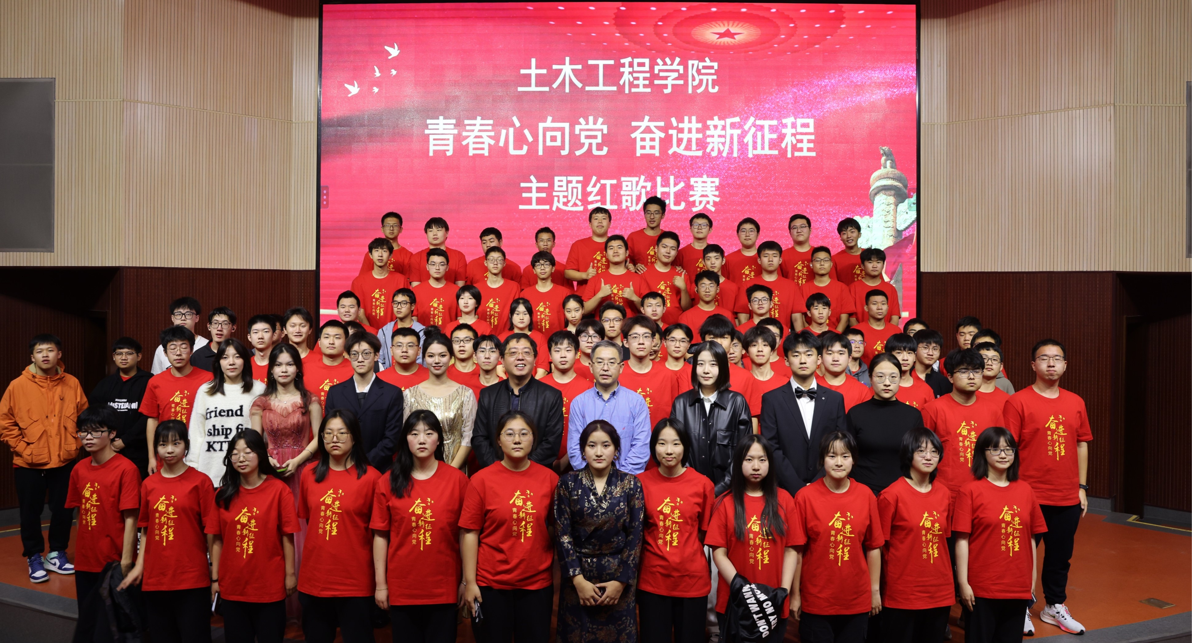 为深入学习贯彻习近平新时代中国特色社会主义思想,落实立德树人根本任务,传承红色基因,凝聚青春力量,持续推进学生思想引领和新生引航工程,10月26日下午,土木工程学院在文化会堂举办了“青春心向党,奋进新征程”主题红歌合唱比赛,学院党委书记张少波、副书记冯少杰、团委书记金磊、辅导员孙永君以及2023级全体新生参加了本次活动。金秋送爽,万里河山披锦绣;红歌嘹亮,一腔热血抒豪情。本次比赛在慷慨雄壮的《没有共产党...