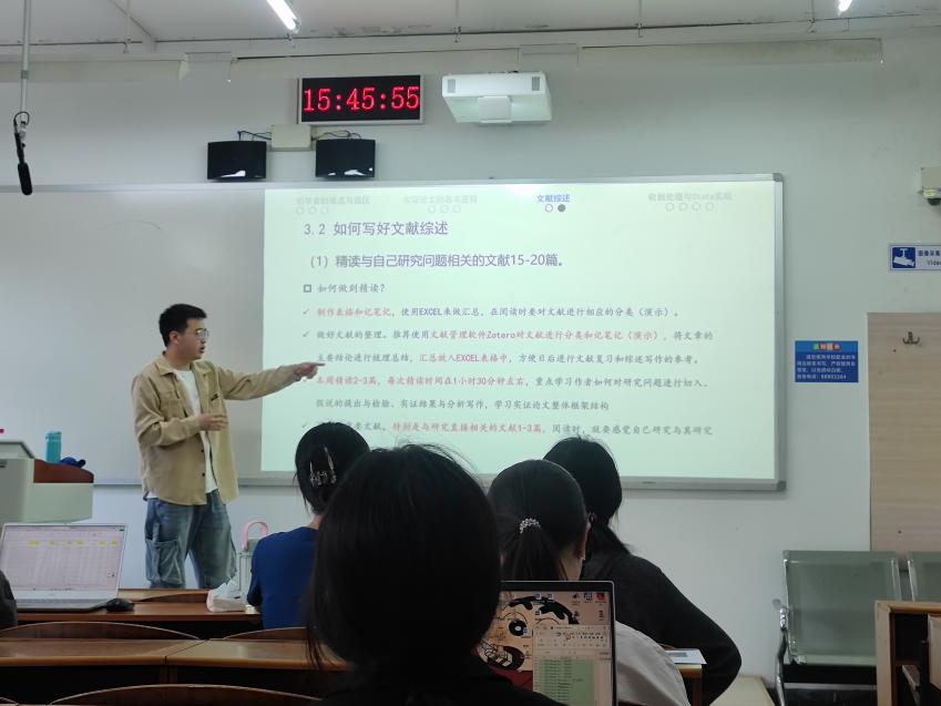 5月8日下午,经济管理学院励学论坛第七期在励学楼310教室举行,beat365官方网站经济管理学院经济研22级在读优秀研究生赖凯丰进行了主题为“研究生论文写作分享”的讲座。本次讲座赖凯丰同学结合自身在学术道路上摸索的经验对研究生论文写作的思路和方法作了详尽的介绍。首先他点出论文初学者的难点和误区,主要是缺乏理论认识和知识创新理解导致内容逻辑不足。其次,讲解了实证论文的基本逻辑。然后着重讲解了论文中的文献综述部分...