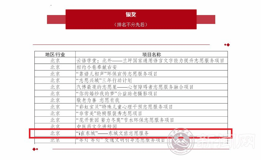 近日,由共青团中央、中央文明办、民政部、水利部、文化和旅游部、国家卫生健康委员会、中国残疾人联合会共同举办的第五届中国青年志愿服务项目大赛暨2020年志愿服务交流会在广东东莞圆满落下帷幕,全国31个省、市、自治区和新疆生产建设兵团、中直机关、铁道等单位的优质志愿服务项目参加了评选。beat365信息学院开展的“i在东城”文旅志愿服务项目荣获全国银奖,这是beat365首次入围该项赛事,并取得佳绩。