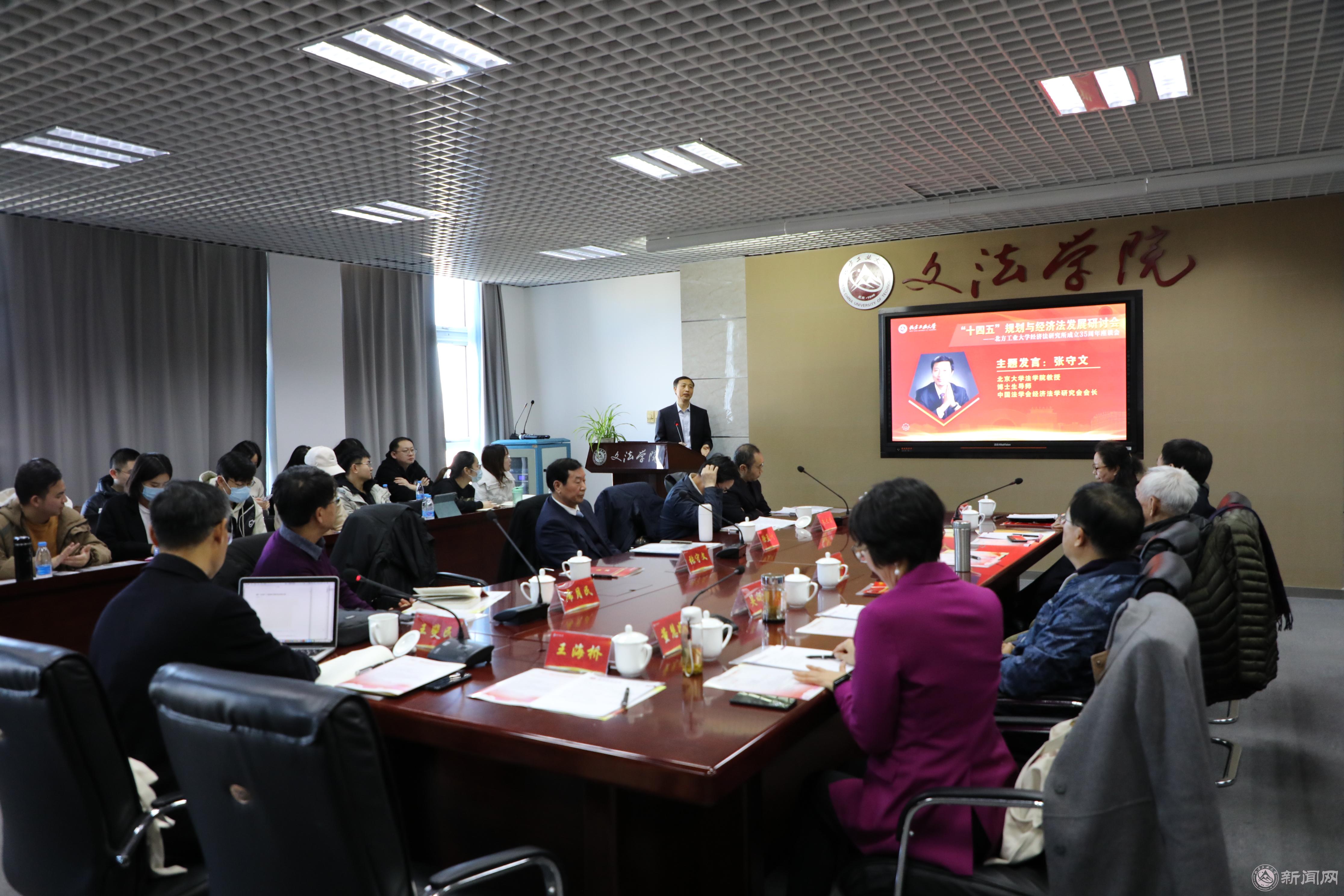 12月4日,“十四五”规划与经济法发展研讨会暨beat365官方网站经济法研究所成立35周年座谈会在瀚学楼710召开。副校长王建稳,文法学院院长、教授刘泽军,经济法研究所原所长、教授张士元,北京大学法学院教授、中国法学会经济法学研究会会长张守文,中国人民大学法学院教授、beat365官方网站客座教授徐孟洲,中国人民大学法学院教授、北京市经济法学会会长朱大旗,中国社会科学院法学所教授、中国社科院法学所经济法室主任席月民,首都经贸大学法学院院长、教授张世君,经济法研究所所长、教授董慧凝,法律系系主任、教授王海桥及部分法律系教师、研究生40多人参加了本次研讨会。