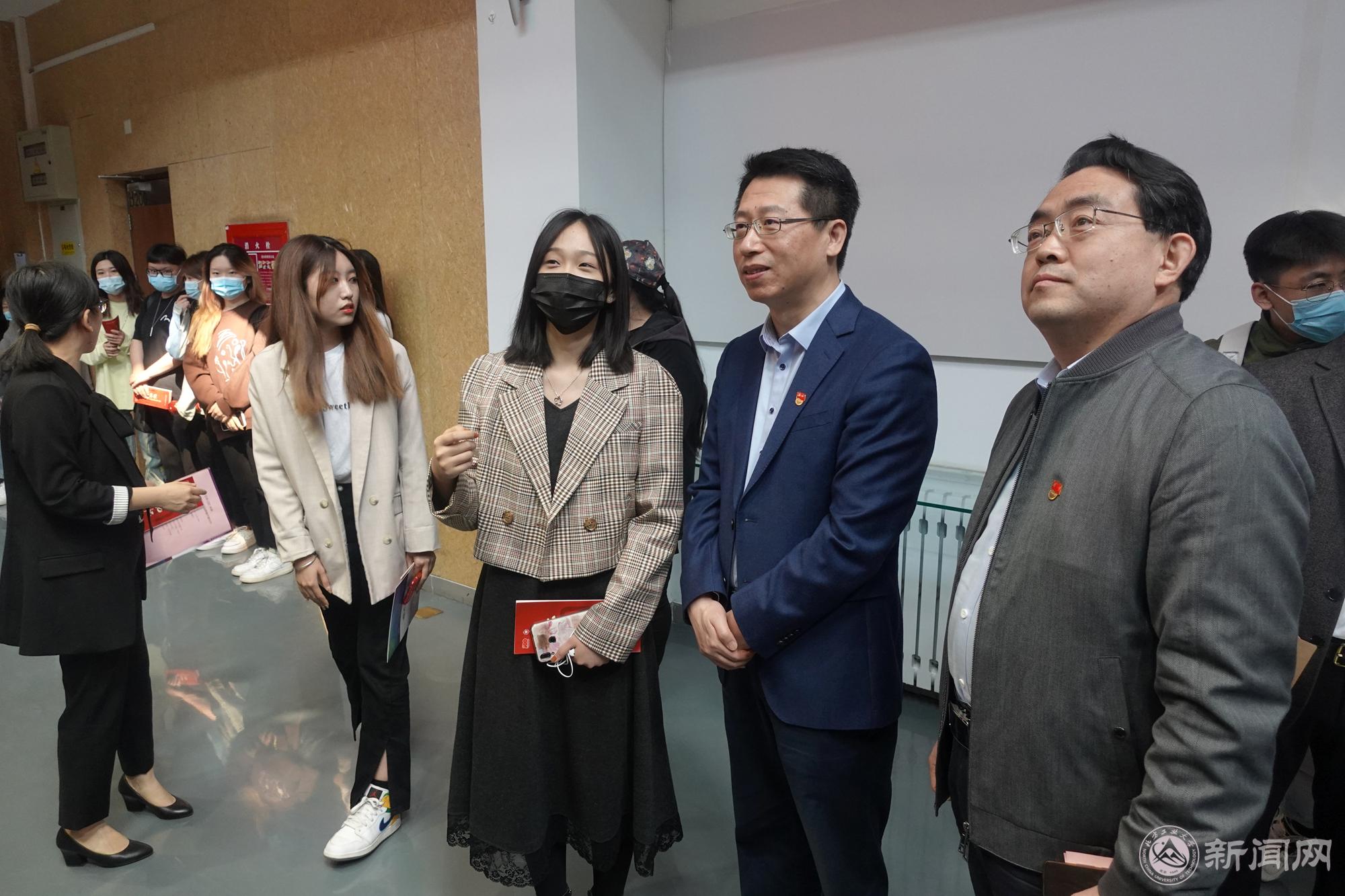 指导教师代表建筑与艺术学院教师王雪莹在发言中分享了学院通过融入红色文化元素推进课程思政建设的经验做法,介绍了自己指导学生进行党史主题海报创作的初衷和过程。海报创作学生代表肖雨晴同学分享了自己学习党史,参与创作的心路历程。参与创作的同学们还在现场向领导、嘉宾讲解了作品的构思和所要表达的主题与思想内涵。