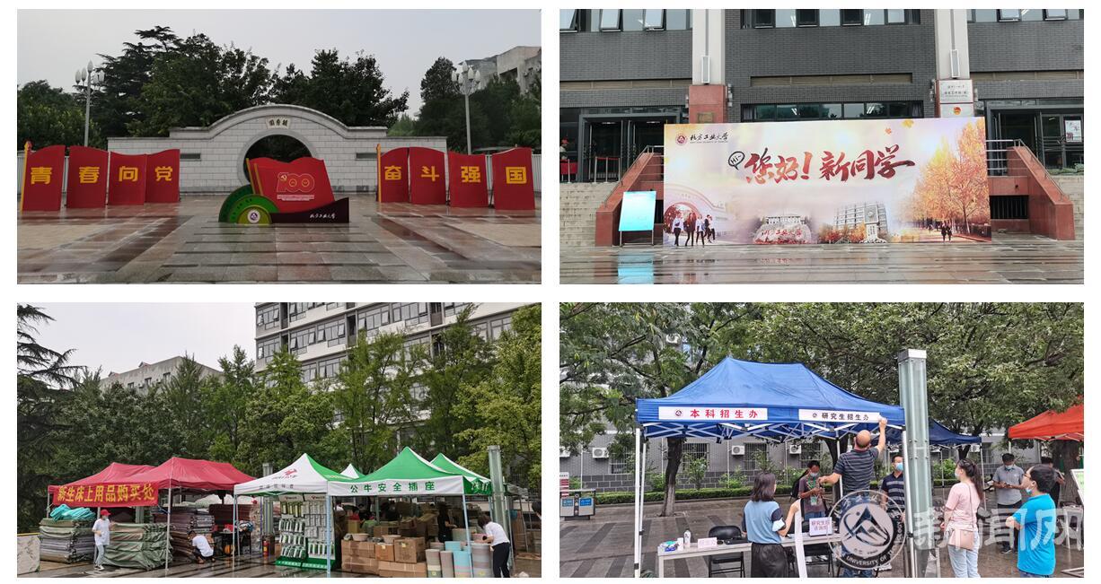 清晨,各学院和职能部门的迎新点就已经就位,老师、学生志愿者和后勤工作人员开始紧张忙碌起来,为迎接新同学步入新家做好准备。