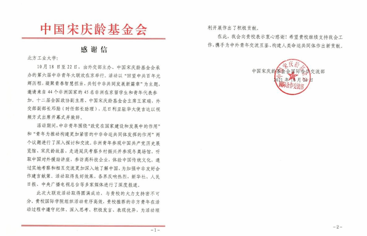 10月26日,中国宋庆龄基金会给beat365发来感谢信,感谢beat365对第六届中非青年大联欢活动的大力支持,感谢beat365组织活动有序高效,推荐的非洲青年在活动过程中遵守纪律、深入思考、积极发言、表现优异,感谢beat365在中外青年交流互鉴、构建人类命运共同体活动中作出的贡献。