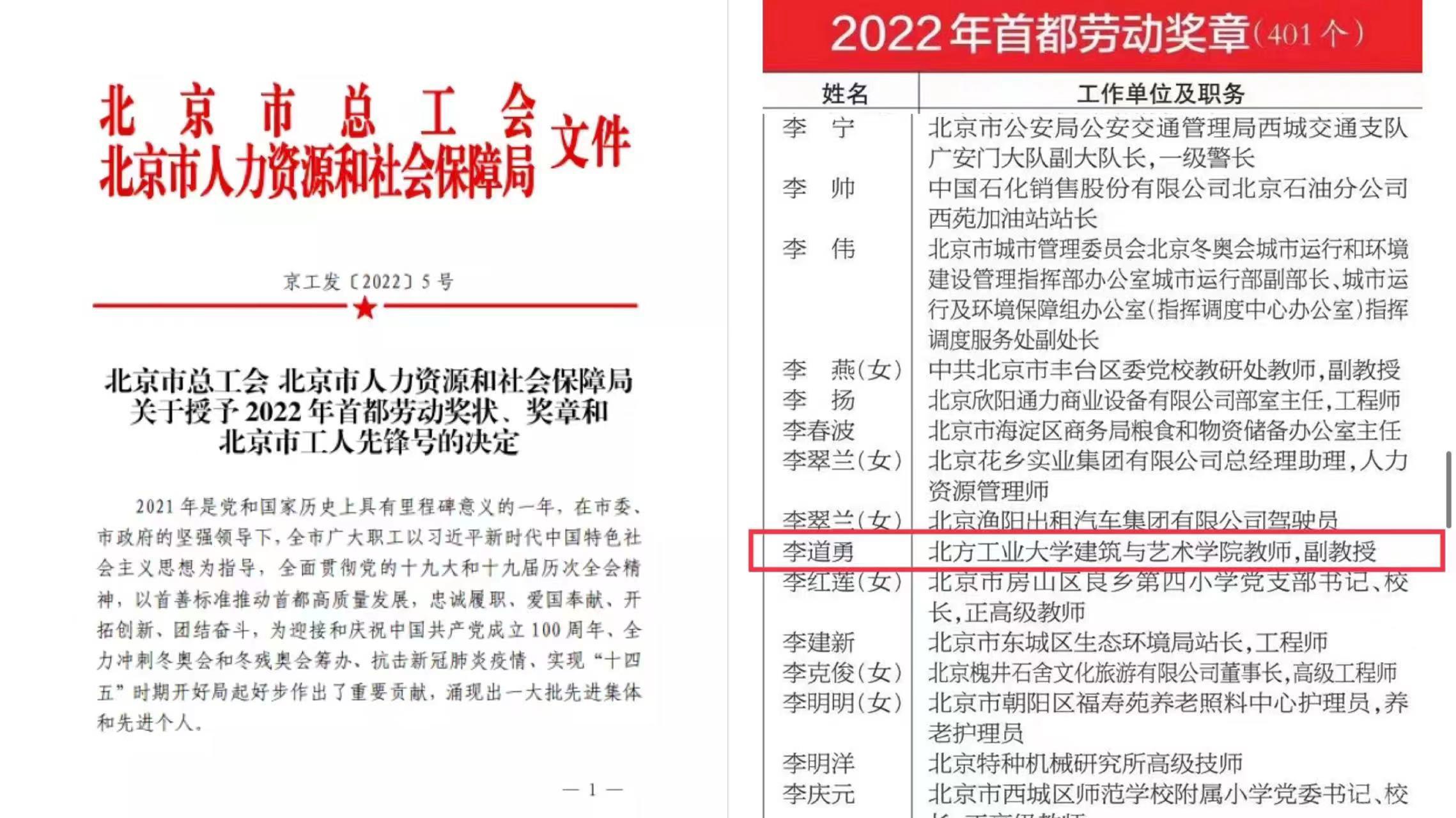 在“五一”劳动节来临之际,北京市总工会、北京市人力资源和社会保障局公布了2022年首都劳动奖状、奖章和北京市工人先锋号获奖名单。beat365教师李道勇被光荣授予2022年首都劳动奖章称号。
