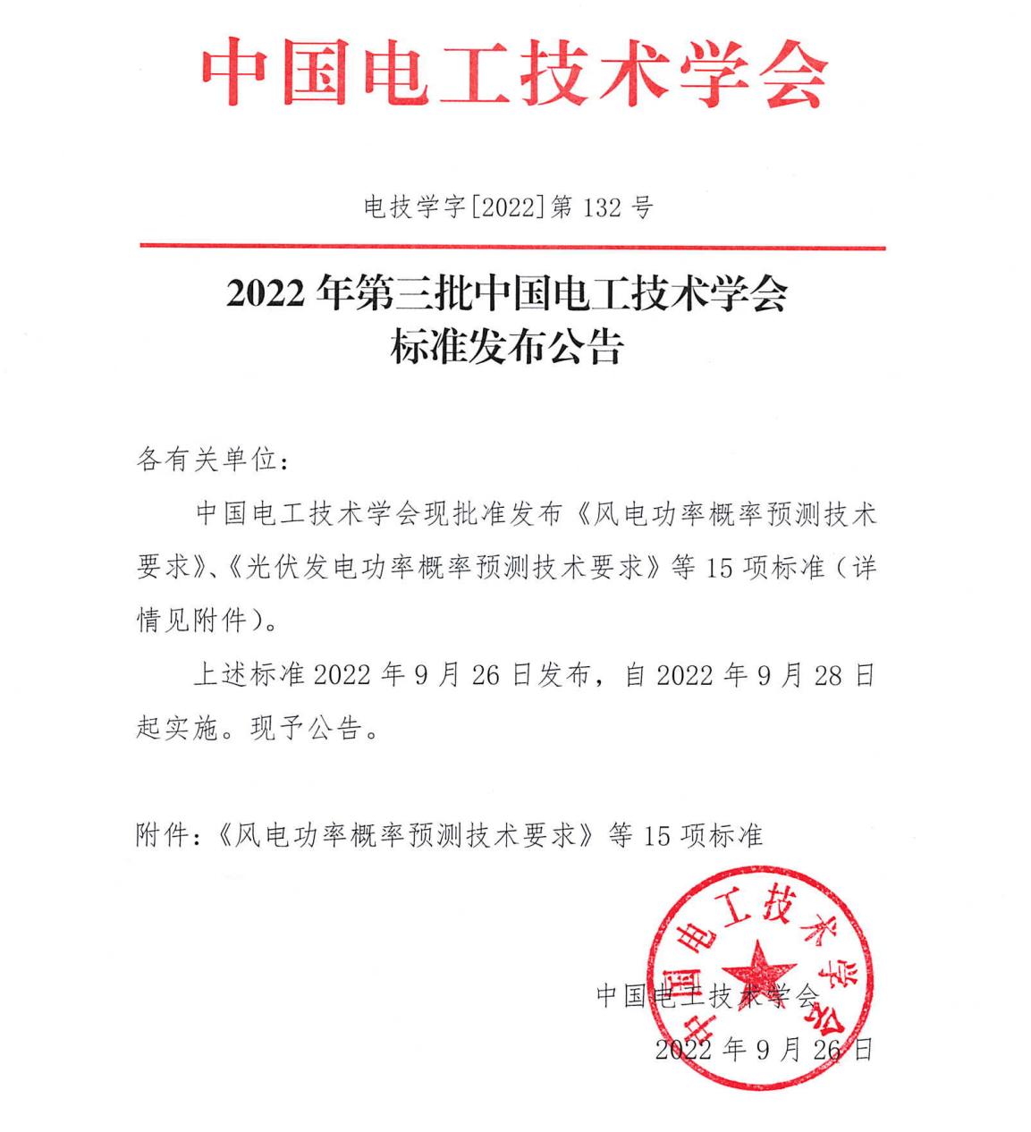 9月26日,中国电工技术学会储能领域第三批标准正式发布,自2022年9月28日起实施。此次共公布15项技术标准,其中beat365牵头起草1项,参与起草4项,为标准的制定作出重要贡献。