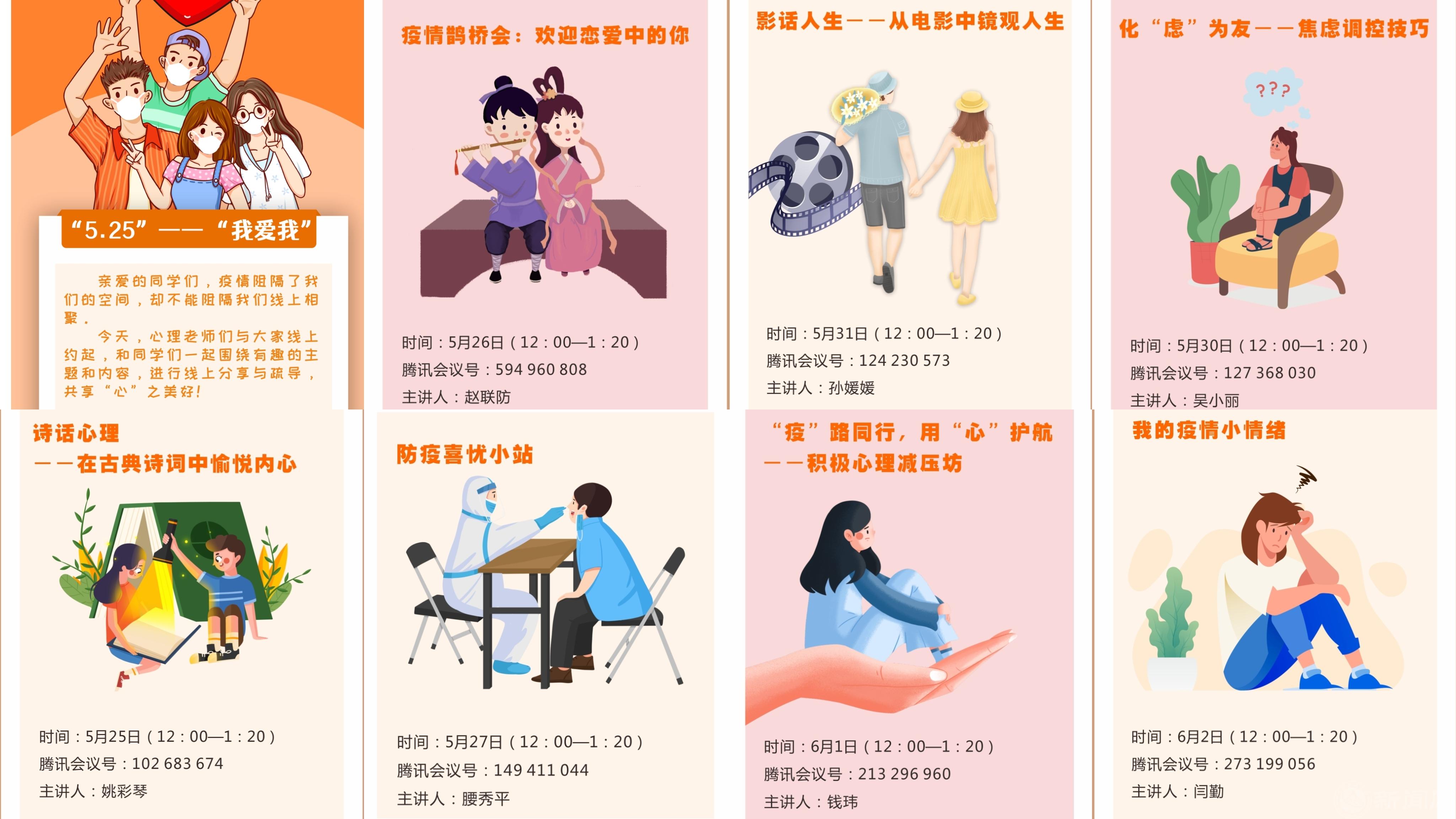 “5.25”心理健康节当日,学校启动了为期一周的“‘线上有约’——与您感受心之美好”心理工作坊,内容涵盖“在古典诗词中愉悦内心”“恋爱中的你”“防疫喜忧小站”“焦虑调控小技巧”“从电影中镜观人生”等不同主题,帮助同学们线上学习时仍能感受校园的精彩,居家生活时不忘保持青春的激情。