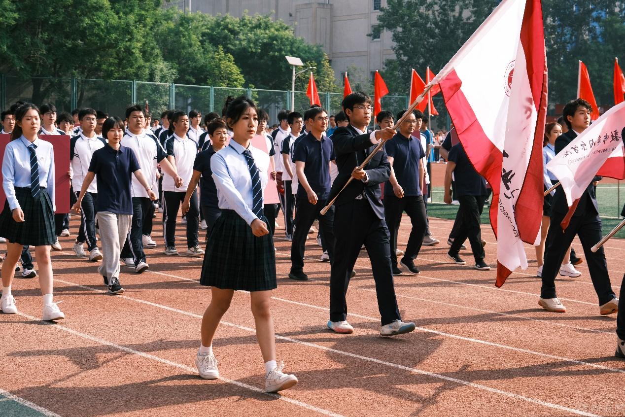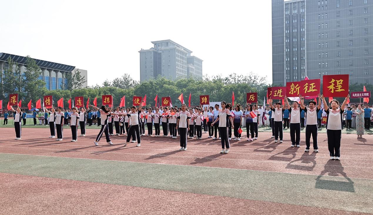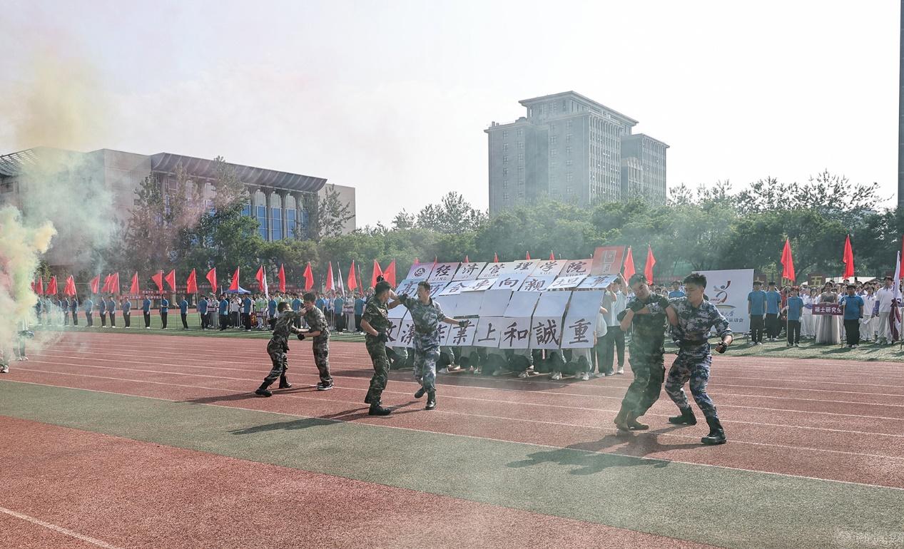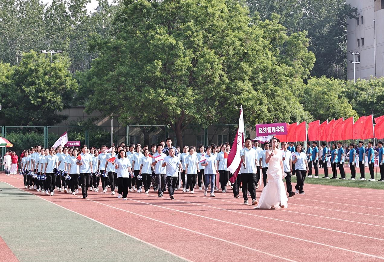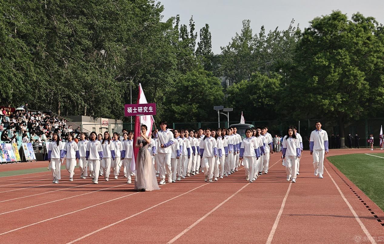 随后是运动员入场仪式。博士研究生方队、硕士研究生方队,以及11个二级学院的方队精神饱满地走进运动场。他们衣着统一、队形整齐、口号嘹亮,各学院班子成员走在所在方队的前列。