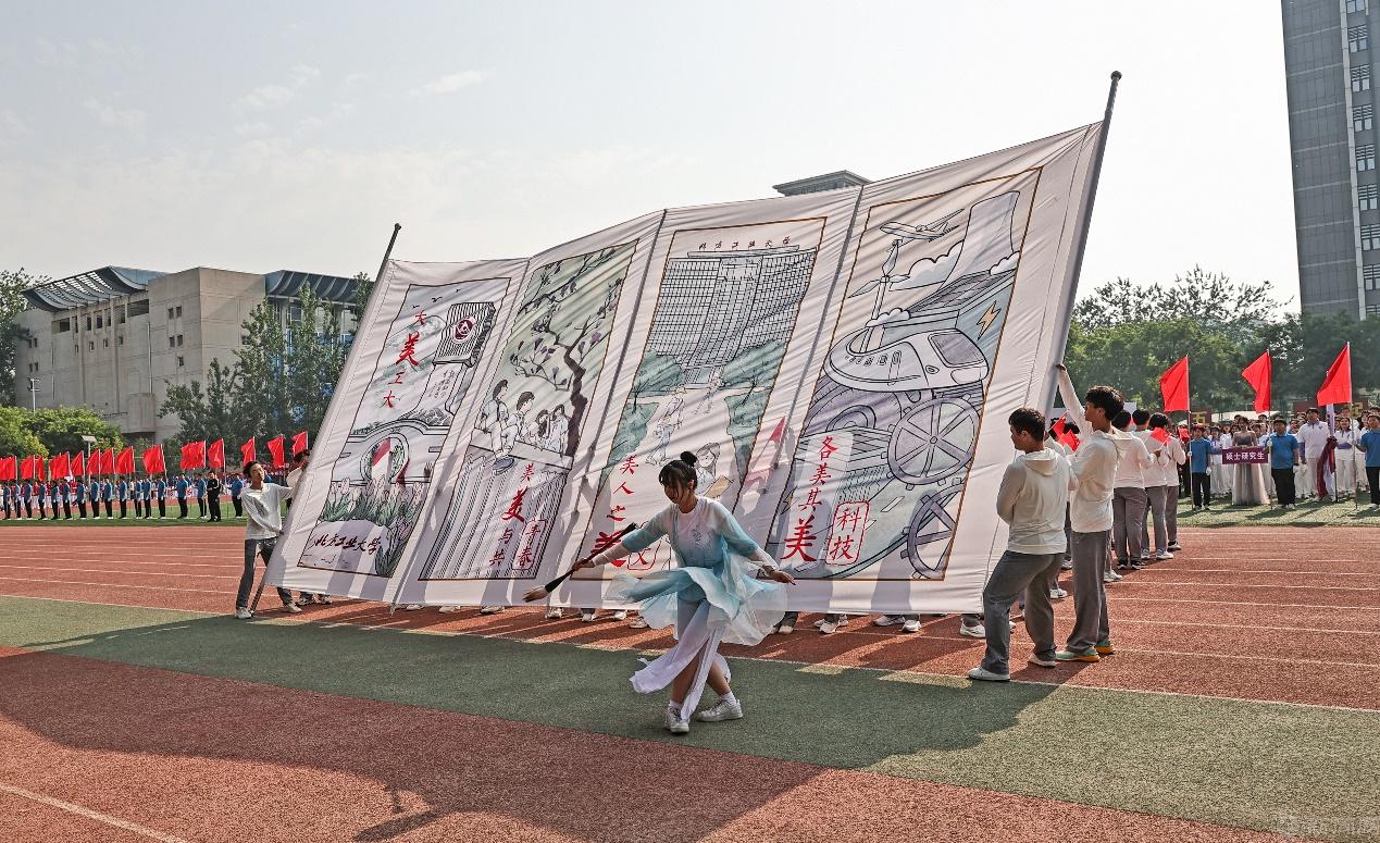 经过主席台时,各方队通过充满创意的方式展示本学院的独特魅力与青春活力。有“把论文写在中国大地上,把汗水挥洒在我的北方”的响亮口号,也有“判天地之美,析万物之理”的壮志豪情;有激情的青春热舞,创意的山水画卷,也有擒拿格斗的铁骨军魂;有充满科技感的成果展示,也有方程式赛车的一骑绝尘……精彩的展示亮出了各学院的精神风貌,迎来阵阵热烈的掌声。