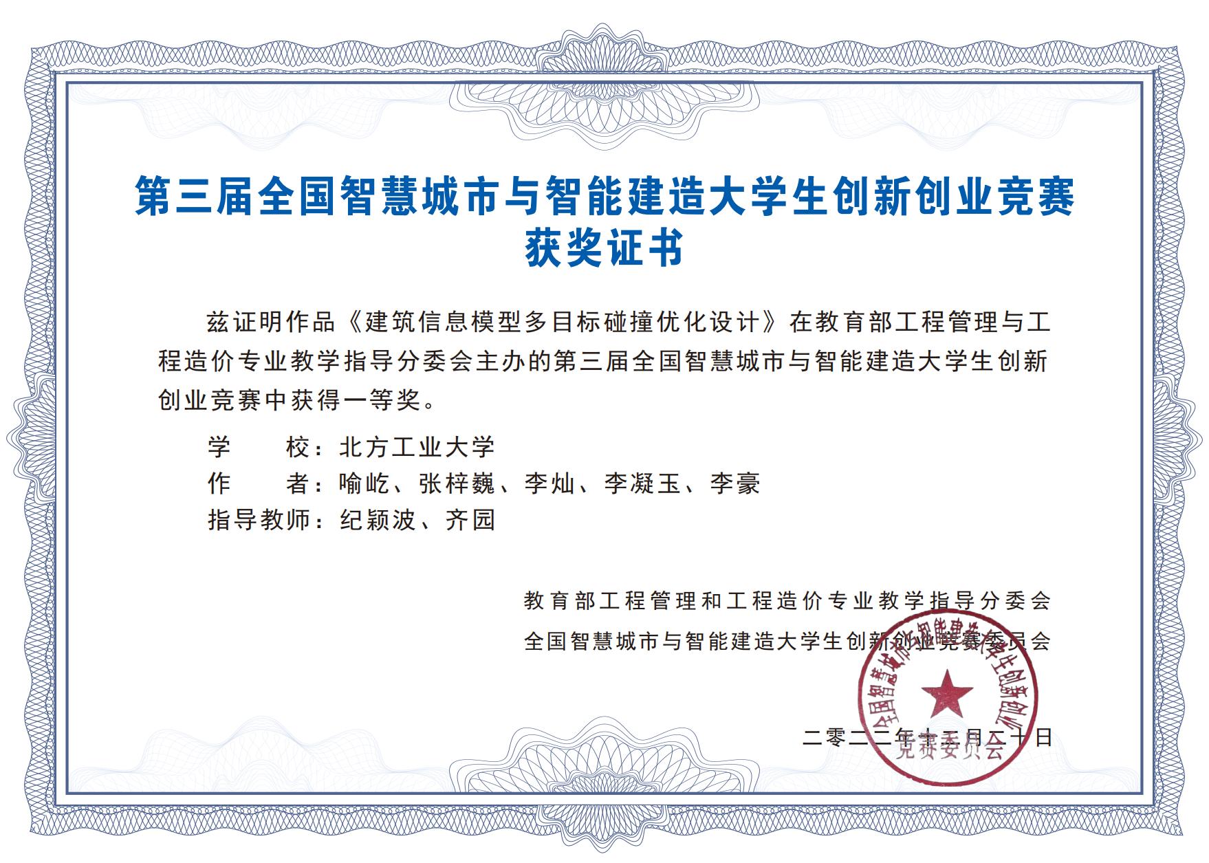 beat365派出了由土木工程学院研究生喻屹、张梓巍、李灿、李凝玉以及本科生李豪组织成的代表队参加了主赛道的竞赛,他们完成的作品《建筑信息模型多目标碰撞优化设计》最终获得大赛一等奖。