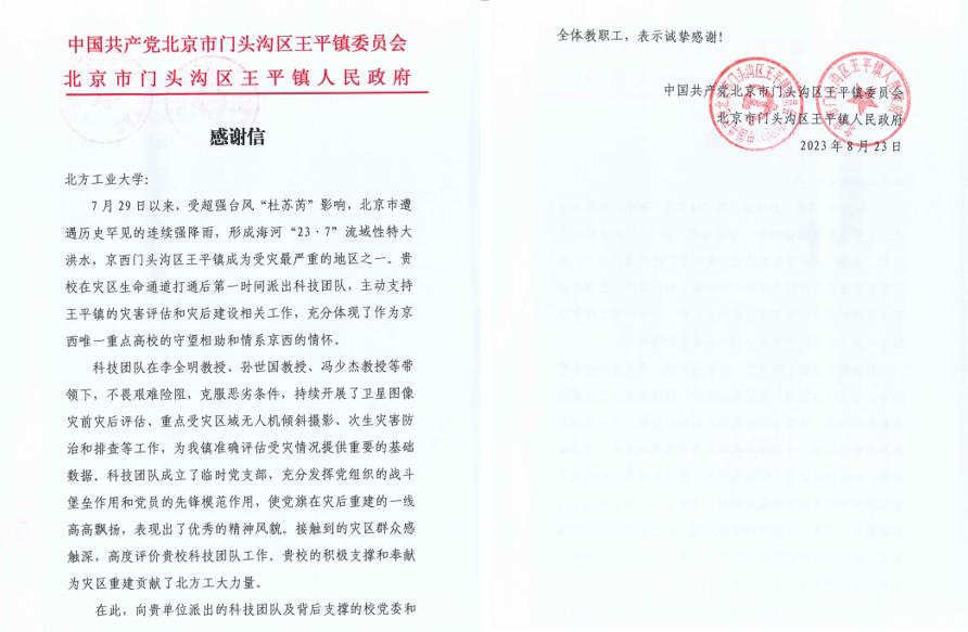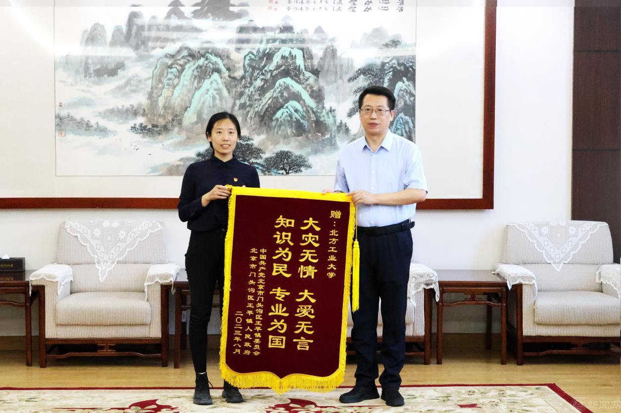 沈若萌代表门头沟区王平镇党委、镇政府向学校赠送了“大灾无情 大爱无言 知识为民 专业为国”的锦旗以及感谢信。