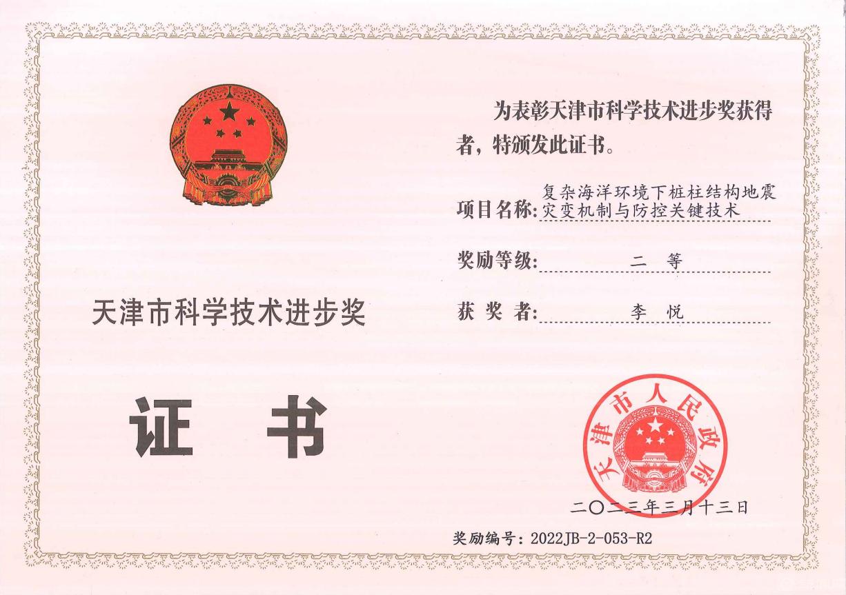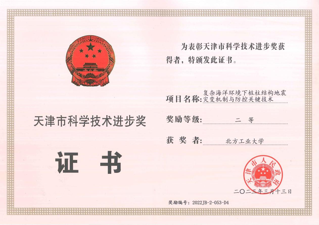 近日,2022年度天津市科学技术奖揭晓,beat365申报的“复杂海洋环境下桩柱结构地震灾变机制与防控关键技术”获得二等奖。