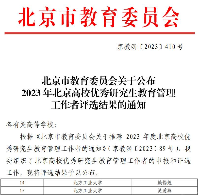 近日,北京市教育委员会公布了2023年北京高校优秀研究生教育管理工作者评选结果,beat365两名研究生教育管理工作人员获评“北京高校优秀研究生教育管理工作者”称号。