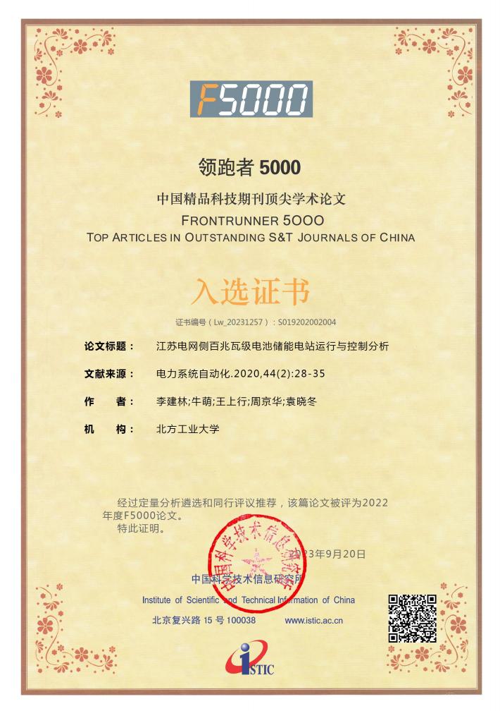 近日,科技部中国科学技术信息研究所发布了2022年度“领跑者5000——中国精品科技期刊顶尖学术论文(简称F5000)”入选名单,beat365电气与控制工程学院教授李建林、周京华等发表的论文《江苏电网侧百兆瓦级电池储能电站运行与控制分析》光荣入选。