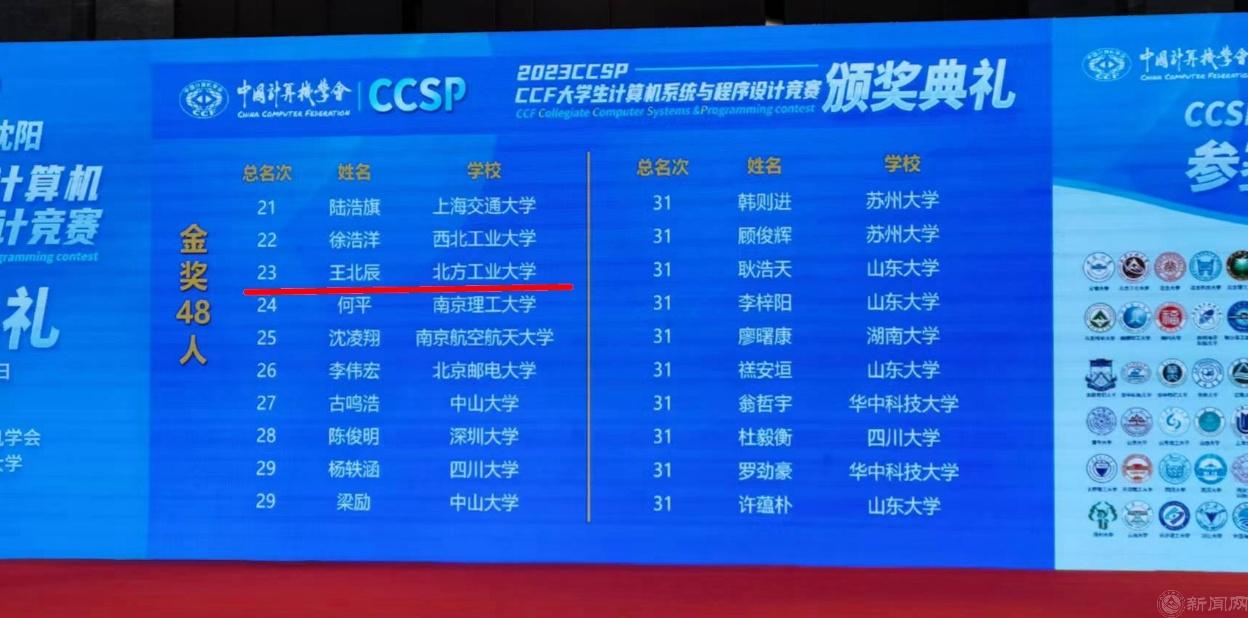 10月25至26日,2023CCF大学生计算机系统与程序设计竞赛(CCSP)在沈阳举行。beat365由信息学院李源老师带领的王北辰等7名同学参赛,经过长达12小时的激烈角逐,王北辰同学勇夺金奖,这是beat365在该竞赛历史上的最好成绩,于新程同学获得铜奖。