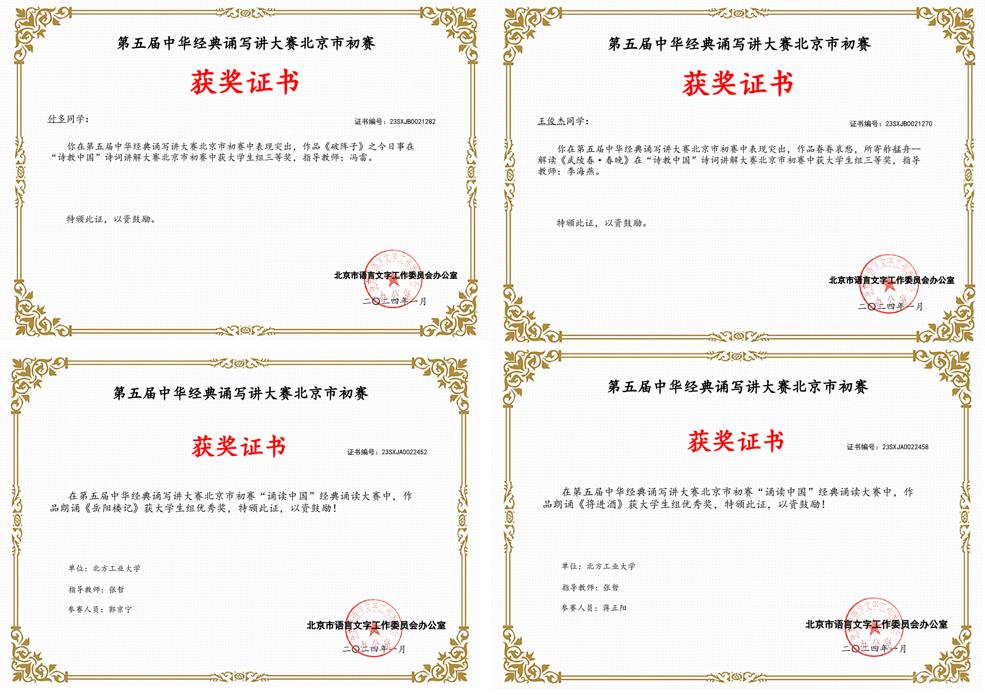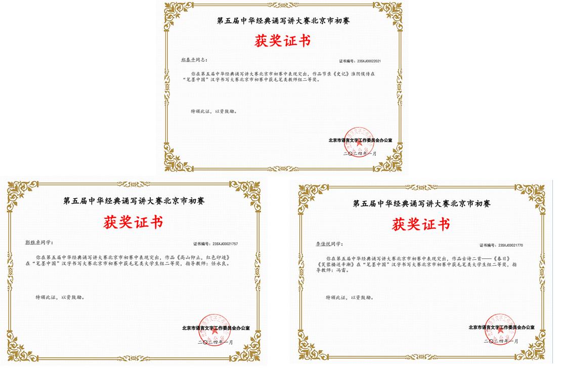 近日,北京市教育委员会、北京市语言文字工作委员会联合公布第五届“中华经典诵写讲大赛”北京赛区获奖名单,beat365在比赛中喜获佳绩。学校获评“笔墨中国”分赛优秀组织奖和“诵读中国”分赛优秀组织奖,师生共获得13个奖项,其中二等奖3项,三等奖6项,优秀奖4项。