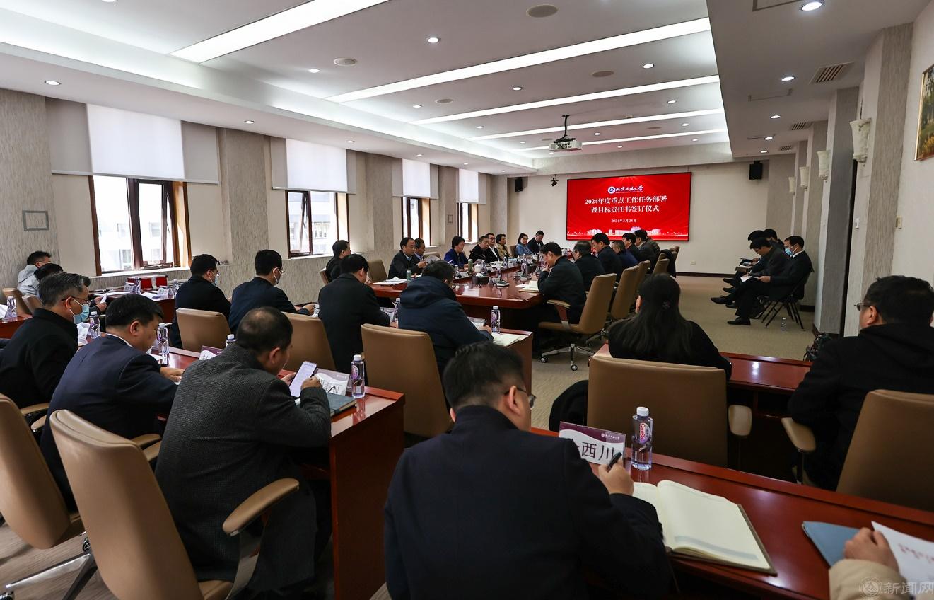 3月28日,学校在敦品楼342会议室举行2024年度重点工作任务部署暨目标责任书签订仪式,对2024年学校重点工作进行再部署再落实。全体在校领导、各职能部门负责人、学院院长及二级单位党委书记参加会议。校党委副书记田红芳主持会议。