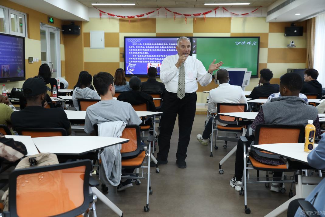 会谈结束后,Hassan Ragab教授面向beat365国际学生做了题为《“一带一路”与中埃文明互鉴》的讲座。Hassan Ragab教授主要从中埃交流历史、“一带一路”倡议、新时代机遇等方面阐述了中埃文明互鉴,以及两国交流与合作在诸多领域取得的丰硕成果、未来机遇与挑战。他表示希望积极践行“一带一路”倡议,不断创新合作形式,推动中埃文明互鉴在当代多个层面上持续深化。Hassan Ragab教授还与现场师生们积极互动,分享了其三十年前在中国的求学经历和汉语学习感悟,并就师生提出的问题进行了亲切交流与解答。