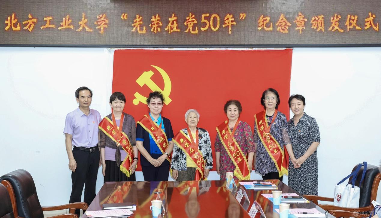离退休党委书记赵永兵宣读了学校2024年获颁“光荣在党50年”纪念章老党员名单。田红芳、王建稳为老党员佩戴纪念章,并同老党员们合影留念。