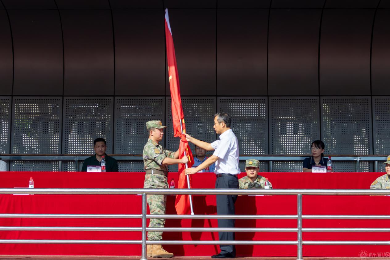 承训部队教官代表马福栋郑重表态:时刻保持军人形象,认真传授军事本领,科学组训,文明施训,确保学生掌握军事技能的同时切实增强学生国防意识,落实好各项安全措施,保证军训过程平稳有序。