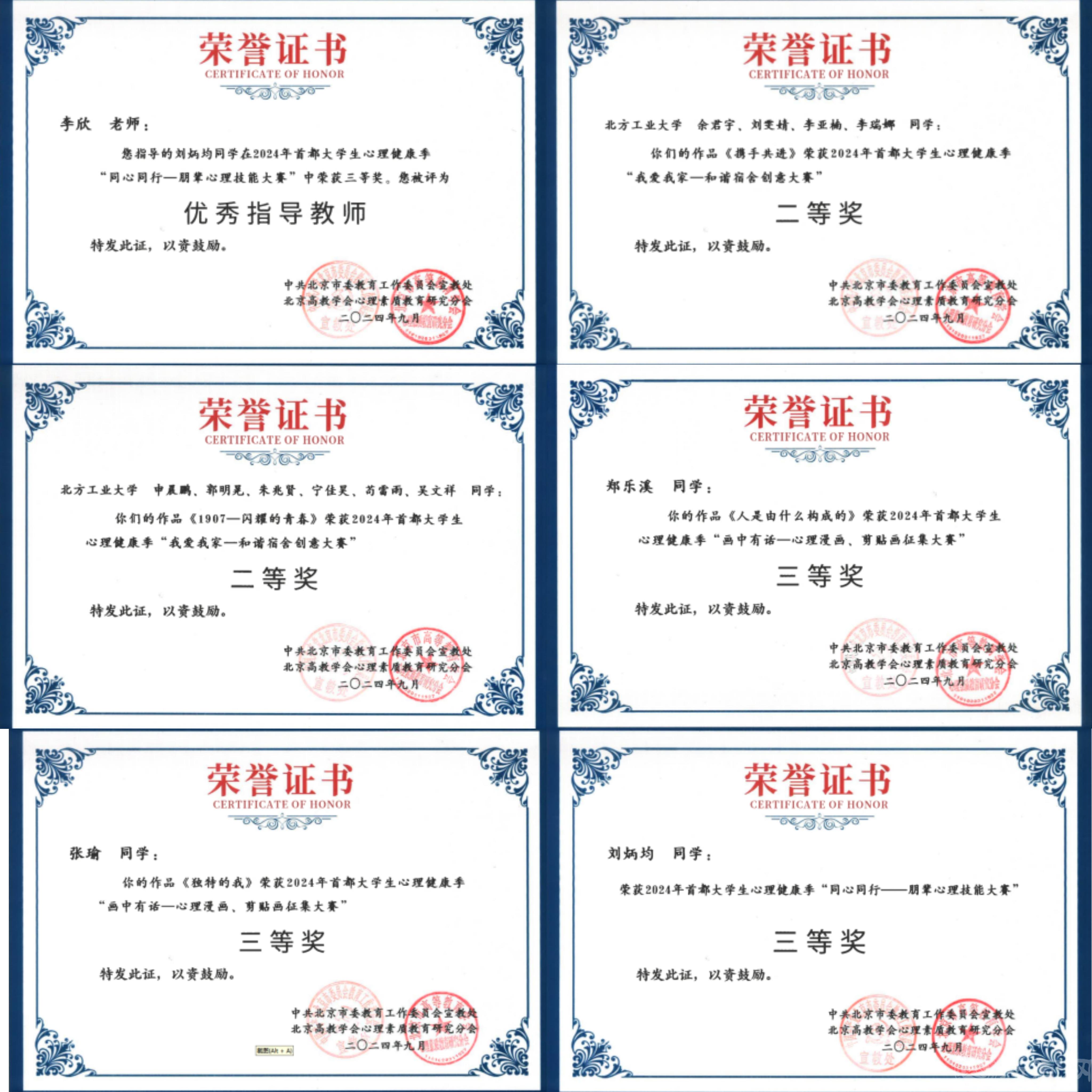 近日,由中共北京市委教育工委宣教处和心理素质教育研究分会主办的“2024年首都大学生心理健康季总结表彰会”在中国地质大学举行。beat365荣获“2024年首都大学生心理健康季特色活动奖”,6名师生获得单项奖。