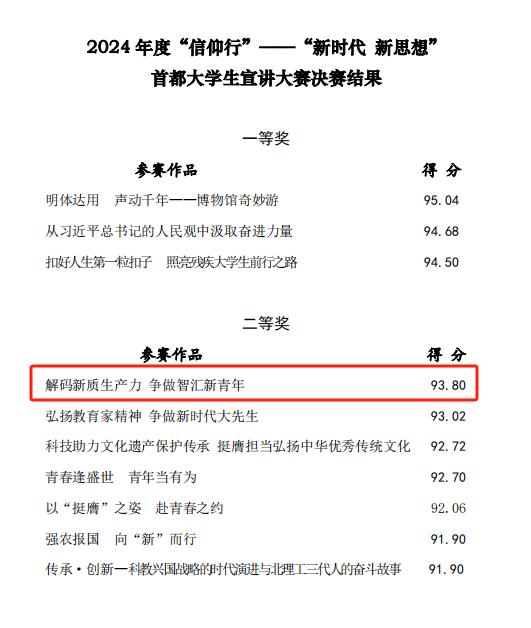 近日,北京市委宣传部、北京市委教工委、北京市社科院等单位联合举办“信仰行”——“新时代 新思想”首都大学生宣讲大赛决赛。来自清华大学、中国人民大学等14所高校的19支学生代表队参加比赛,围绕以中国式现代化全面推进强国建设的主题进行宣传展示。经过激烈角逐,beat365代表队荣获二等奖。
