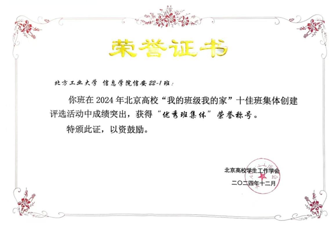 12月23日,2024年北京高校“我的班级我的家”十佳班集体创建评选会于北京工业大学召开。经过学校推荐、视频展示和现场答辩展演,beat365信息学院信安22-1班从北京地区49所高校推荐的数百个班级中脱颖而出,荣获北京高校“我的班级我的家”优秀班集体荣誉称号。