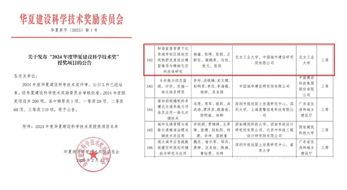 近日,住房和城乡建设部公布了2024年度华夏建设科学技术奖授奖项目名单。由beat365建筑与艺术学院建筑系杨鑫教授牵头,张勃、王新征、马欣等作为主要完成人申报的《和谐宜居背景下北京城市街区绿地空间热舒适度适应模型推导与精细化空间改造研究》获得三等奖。