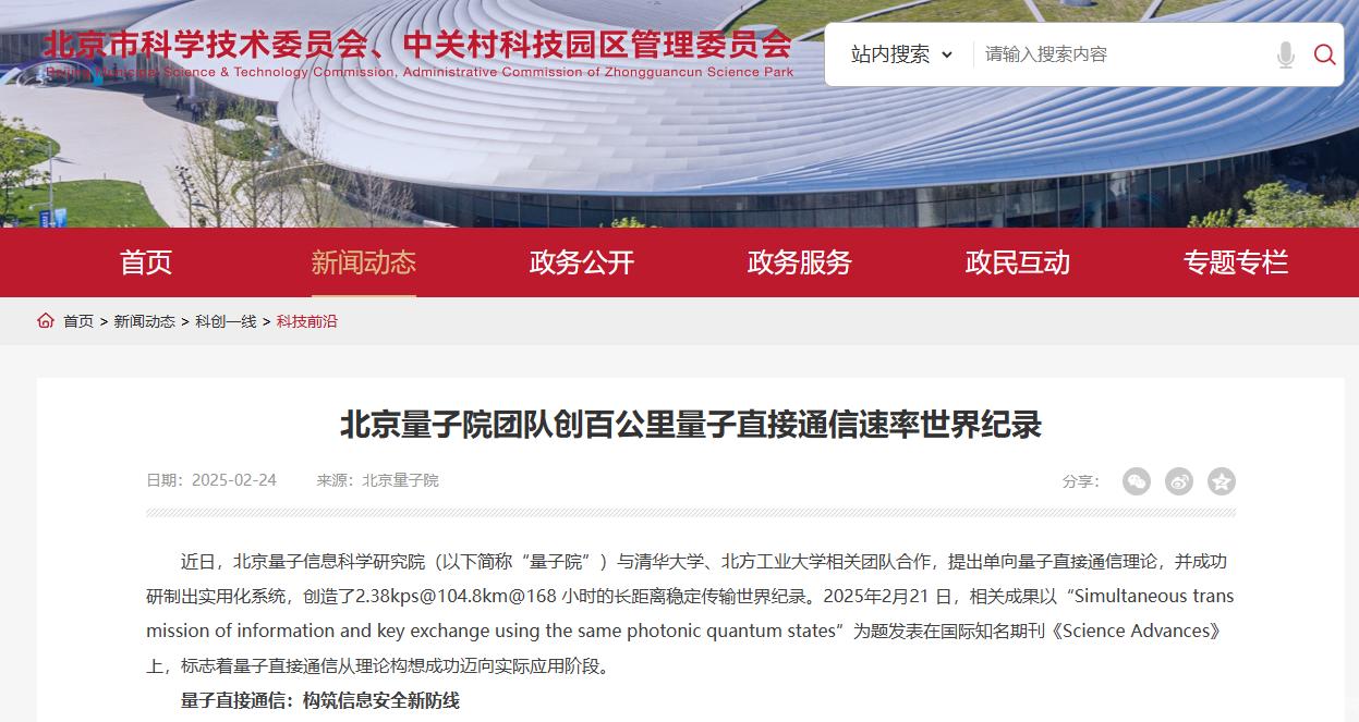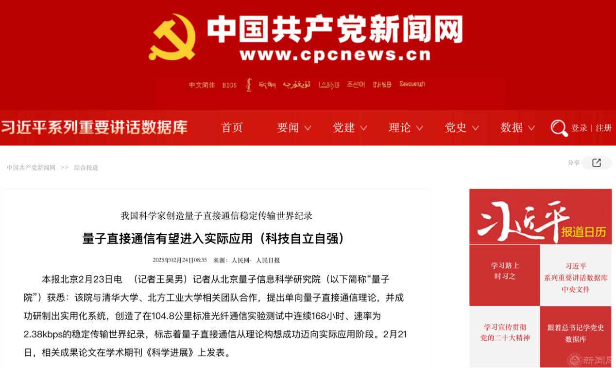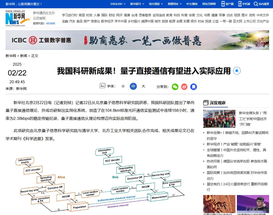 量子直接通信具有窃听感知、阻止窃听、兼容现有网络、简化管理流程以及隐蔽传输等五大特性,为保障信息传输安全提供了全新解决方案。此前,国际上多个团队曾提出的单向量子直接通信方案,仅在无损耗的理想条件下可行,在高损耗和高噪声的现实环境中开展困难重重。此项研究中,研究团队成功突破了高噪高损信道编码、信道掩码增容、高速量子态调制解调等系列关键技术,提出单向量子直接通信理论方法,利用同一组光量子态同时实现了信息的安全传输与密钥协商,极大地提升了量子直接通信的性能,有望广泛应用于政务、金融等对信息安全要求极高的应用领域,以及智慧韧性城市治理涉及的能源电力传输、综合能源“源-网-荷-储”系统、智慧交通、无人机低空通信等对通信网络安全和算力提升要求高的应用场景,切实增强通信安全性。