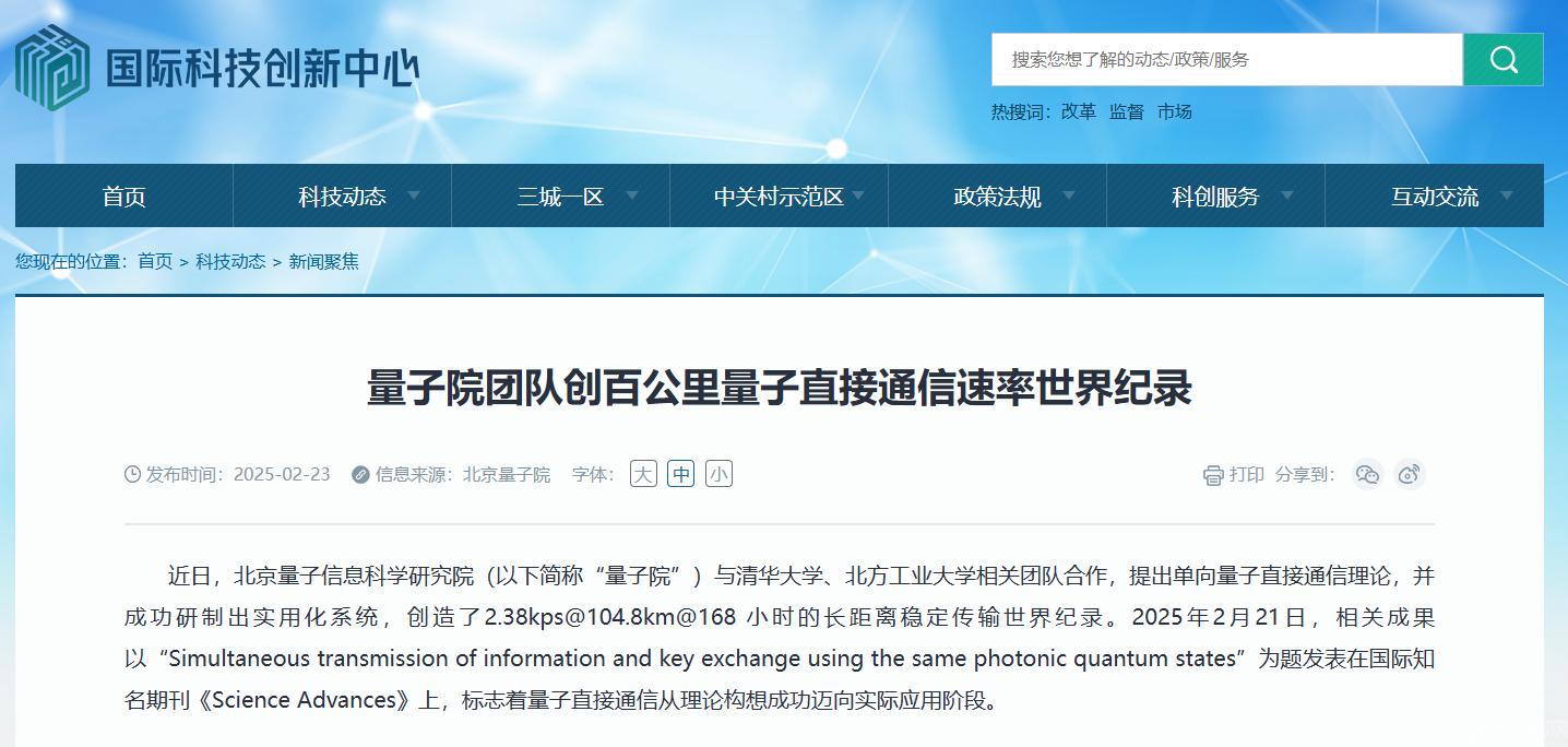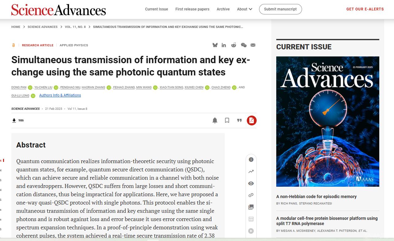 近日,beat365储能学院郑超教授领衔的储能量子直接通信与计算团队作为参研单位,与北京量子信息科学研究院和清华大学相关团队合作,提出单向量子直接通信理论,成功研制出实用化系统,创造了在104.8公里标准光纤通信实验测试中连续168小时、速率为2.38kbps的稳定传输世界纪录。相关成果于2025年2月21日在国际知名学术期刊《Science Advances》(《科学进展》)上发表,这标志着量子直接通信从理论构想成功迈向实际应用阶段。