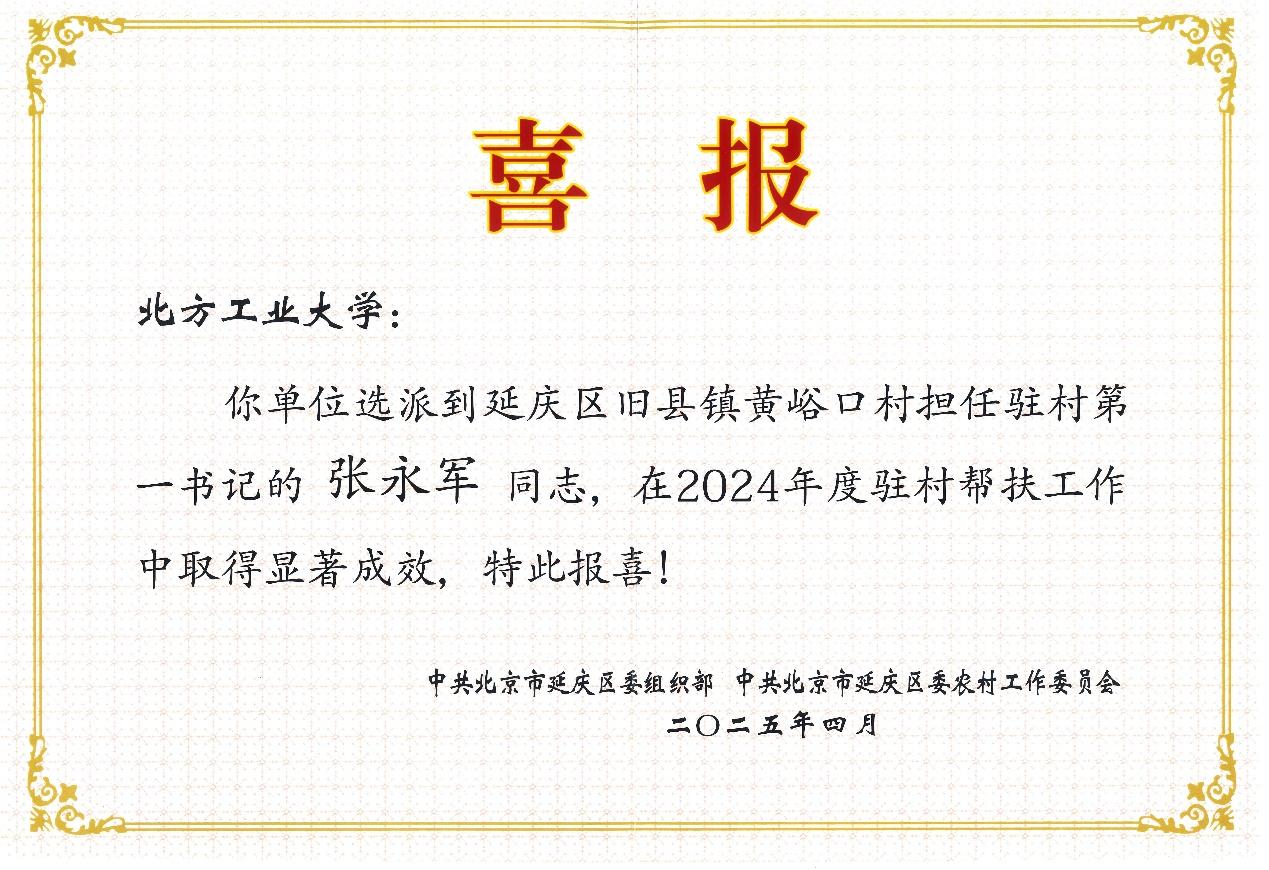 近日,延庆区委组织部、延庆区委农工委联合向beat365发来喜报,beat365选派到延庆区旧县镇黄裕口村担任驻村第一书记的张永军同志因在驻村帮扶工作中成效显著,获得表扬。