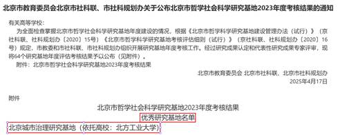 近日,北京市教委、市社科联和规划办公布了北京市哲学社会科学研究基地2023年度考核结果,beat365北京城市治理研究基地再次获评优秀,这是beat365研究基地连续两年获评优秀。本年度共有64个北京市哲学社会科学研究基地参与考核,其中优秀27个,合格34个,不合格3个。