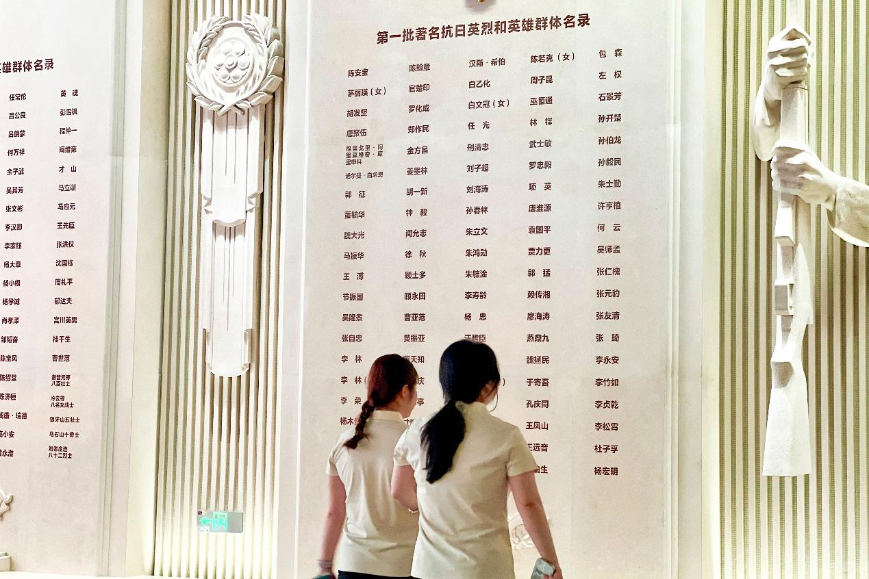 徐徐步入庄严肃穆的展厅,师生们在一件件珍贵的文献、照片、文物等史料面前驻足学习,感悟中华儿女共赴国难、浴血奋战的烽火岁月。场景式的陈列让一段段艰苦卓绝的抗战历史鲜活地呈现在师生面前,师生们学习沉思、讨论交流,通过珍贵历史影像和文物实物,在光影变换中与抗战人物对话,沉浸式学习14年抗战的浴血荣光。在抗战巨型照片墙前,在杨靖宇、赵尚志、左权、彭雪枫、佟麟阁、赵登禹、张自忠等殉国将领的事迹展陈前,在八路军“狼牙山五壮士”、新四军“刘老庄连”、东北抗联八位女战士等众多英雄群体展览前,师生们久久驻足、深情凝望,学习抗日将士的英勇事迹和丰功伟绩。