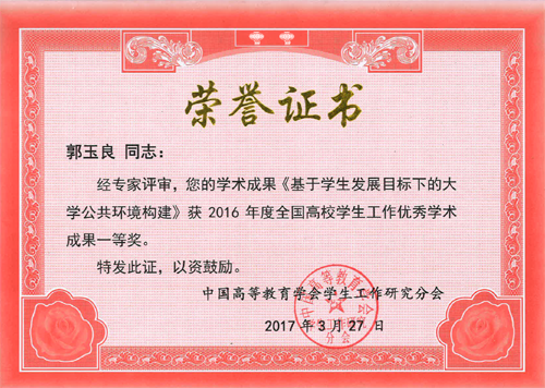 郭玉良同志的论文《基于学生发展目标下的大学公共环境构建》获得一等奖;陈勇钢同志的论文《精细化管理视域下高校新生活适应性研究》、王伟宾同志的论文《大数据视角下理工类成功考研学生的群体性特征分析及启示》、钱昌照同志的论文《大学生认同社会主义核心价值观的现实意蕴与路径》分别获得二等奖。