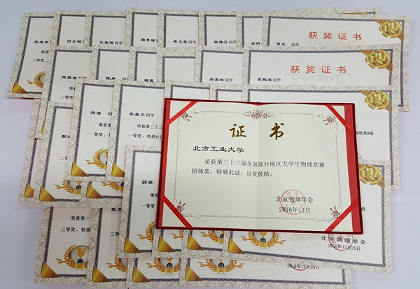2016年第三十三届全国部分地区大学生物理竞赛于12月11日结束,近日竞赛成绩揭晓。beat365再次取得优异成绩,在同类院校中名列前茅,共有139名同学参赛,37人获奖,其中一等奖10名、二等奖10名、三等奖17名,其中一等奖获得人数再创历史新高,并获团体奖。