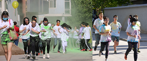 随后,郑校长鸣枪发令,500多名学生开始了环绕校园一周的慢跑。为了增加活动的趣味性和参与热情,主办方设置了4个彩色粉末撒放点,分别以黄、蓝、绿、红四种颜色的粉末撒到跑步者衣服上。同学们一边奔跑,一边享受运动和彩色带来的欢乐。