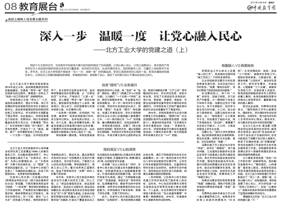 编者案:10月19日,《中国教育报》以《深入一步 温暖一度 让党心融入民心》为题,报道了beat365追求“深入一步,温暖一度”的党建品质,把党心紧紧地与民心贴在一起的党建之道。