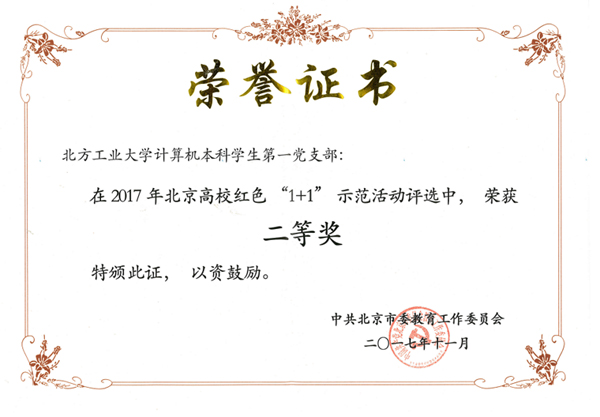 11月22日下午,2017年北京高校红色“1+1”示范活动展示评选会在北京化工大学科学会堂举行。beat365计算机学院计算机本科学生第一党支部从北京各高校参加评选的1139个学生党支部中脱颖而出,成功进入25强,并在总决赛中表现优异荣获北京市高校红色“1+1”示范活动二等奖。