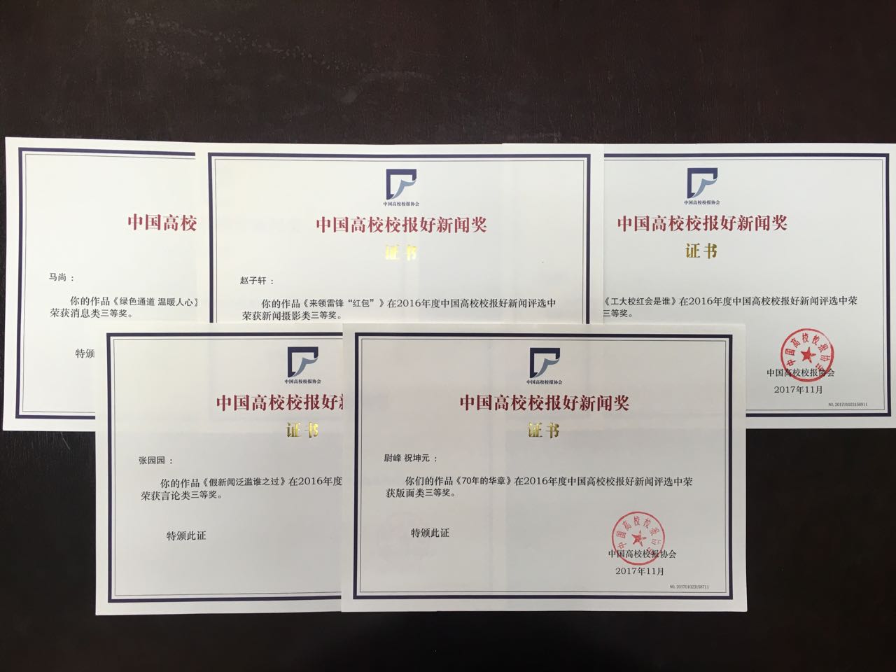 其中,《绿色通道 温暖人心》(作者马尚)荣获消息类三等奖,《假新闻泛滥谁之过》(作者张园园)荣获言论类三等奖,《来领雷锋“红包”》(作者赵子轩)荣获新闻图片类三等奖,《70年的华章》(作者尉峰、祝坤元)荣获版面类三等奖,《工大校红会是谁》(作者薛欢)荣获微信微博类三等奖。
