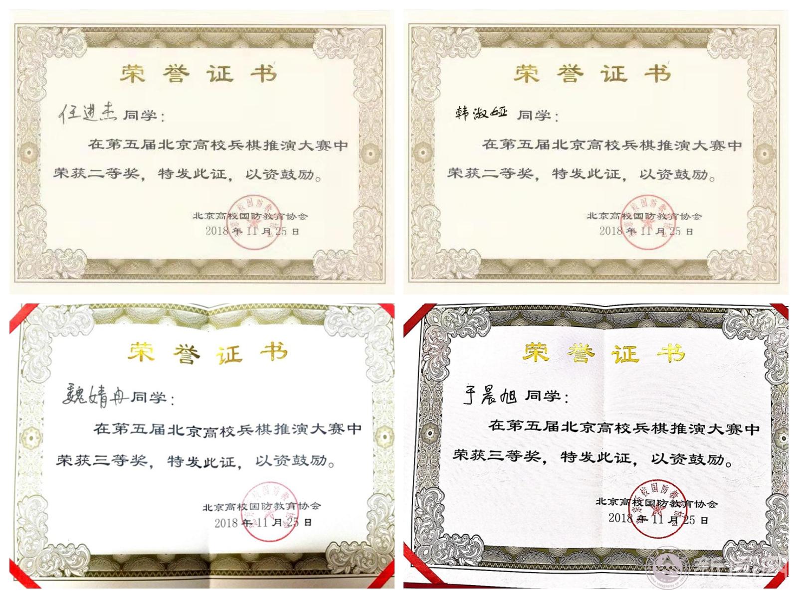 11月24日至25日,由北京高校国防教育协会主办,清华大学承办的第五届北京高校兵棋推演大赛在清华大学射击馆举行。此次大赛围绕“陆空联合攻防作战”开展,来自北京29所高校的54支代表队、共108名参赛选手展开了为期两天、共55场次的角逐。经过激烈角逐,beat365任进杰和韩淑娅、魏婧冉和于晨旭同学组成的两支参赛队伍分别荣获二等奖及三等奖,学校获评优秀组织奖。