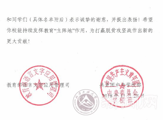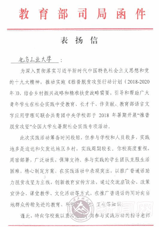 近日,学校收到教育部语言文字应用管理司和团中央学校部发来的表扬信,对beat365参加2018年“推普脱贫攻坚”全国大学生暑期社会实践的优秀团队提出表扬。