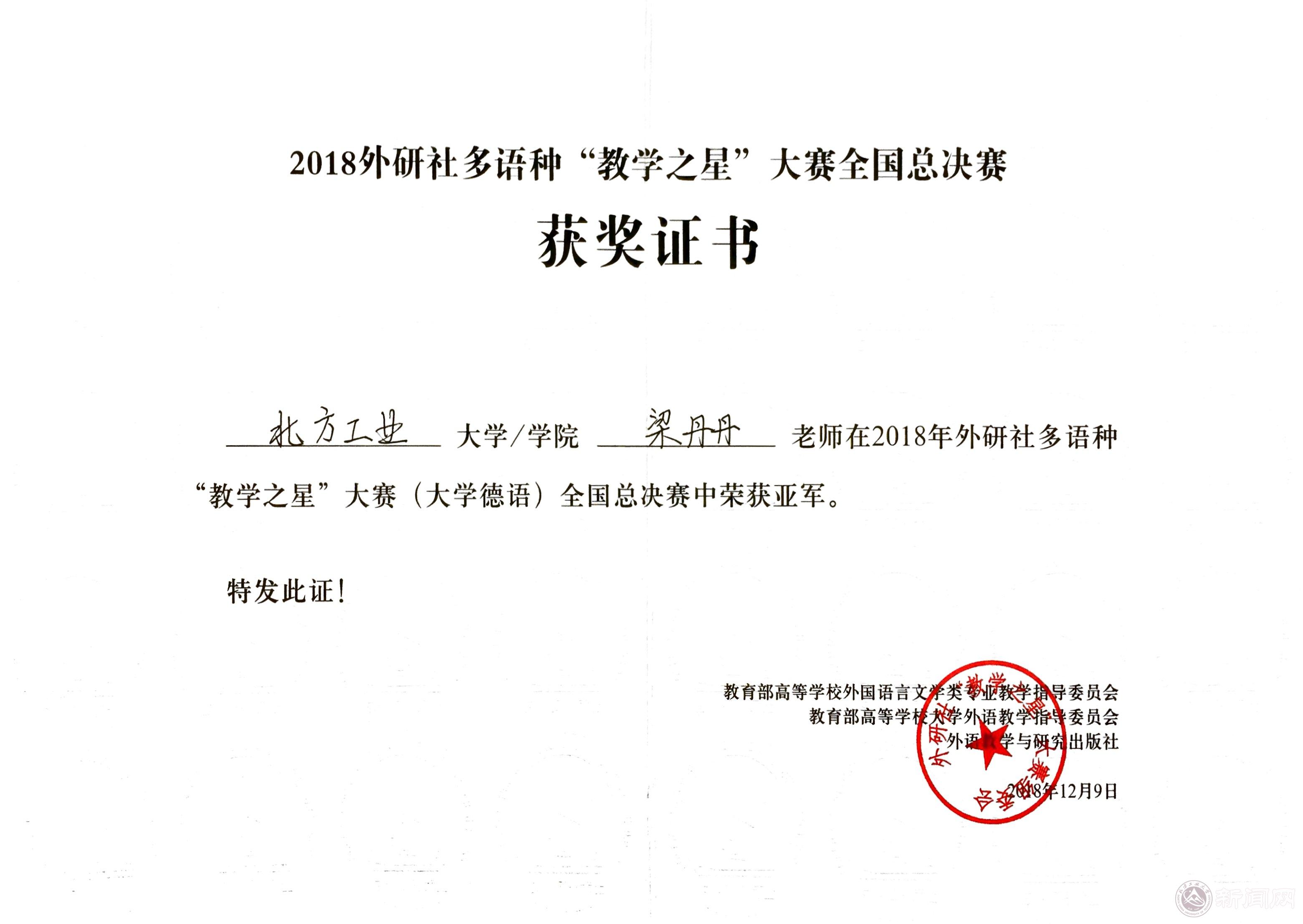 12月9日,由教育部高等学校外国语言文学类专业教学指导委员会、教育部高等学校大学外语教学指导委员会和外语教学与研究出版社共同举办的外研社杯多语种“教学之星”大赛全国总决赛落下帷幕,beat365文法学院英语系梁丹丹老师获得大学德语组亚军。