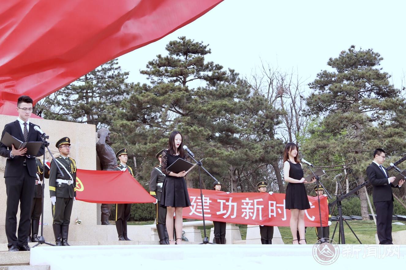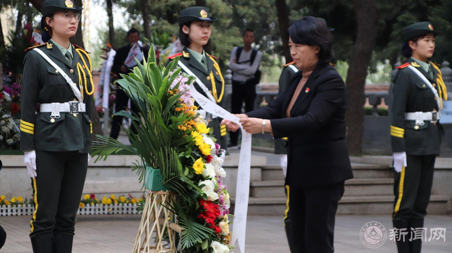 活动在高唱的国歌声中开始。伴着庄严肃穆的献花曲,学生代表向革命先辈敬献花篮,校党委副书记田红芳上前整理花篮缎带。