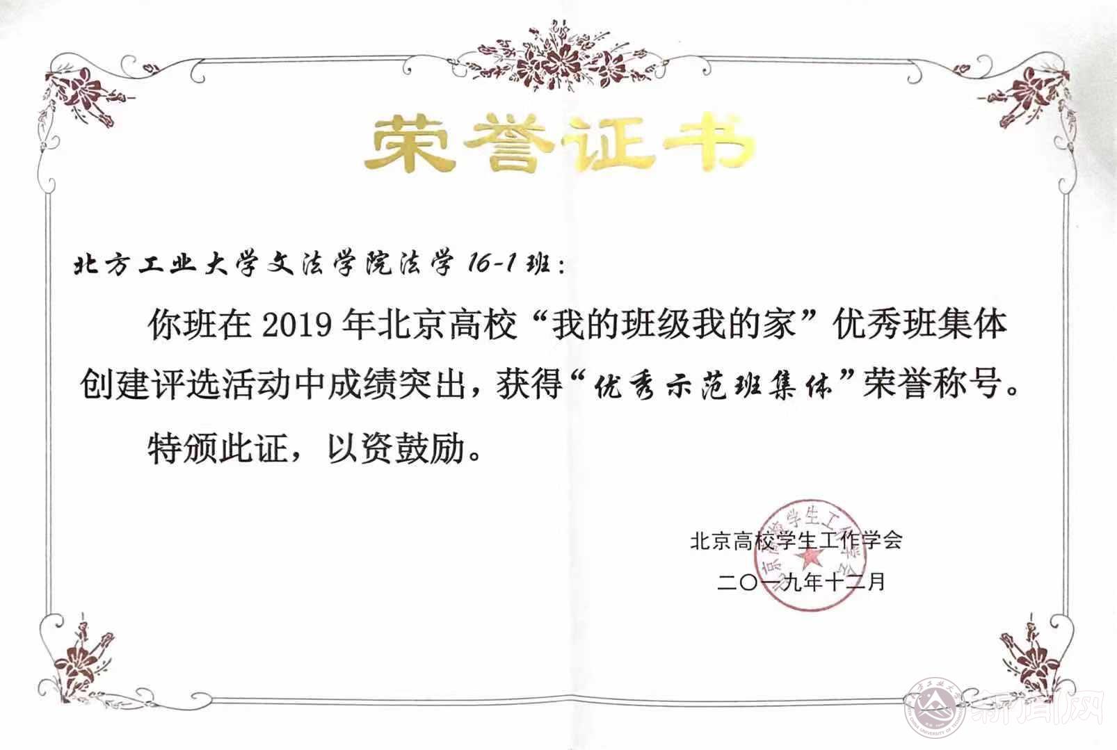 12月20日,2019年北京高校“我的班级我的家”优秀班集体创建答辩评选会在北京工业大学举行。beat365文法学院法学16-1班获得北京高校“优秀示范班集体”称号。