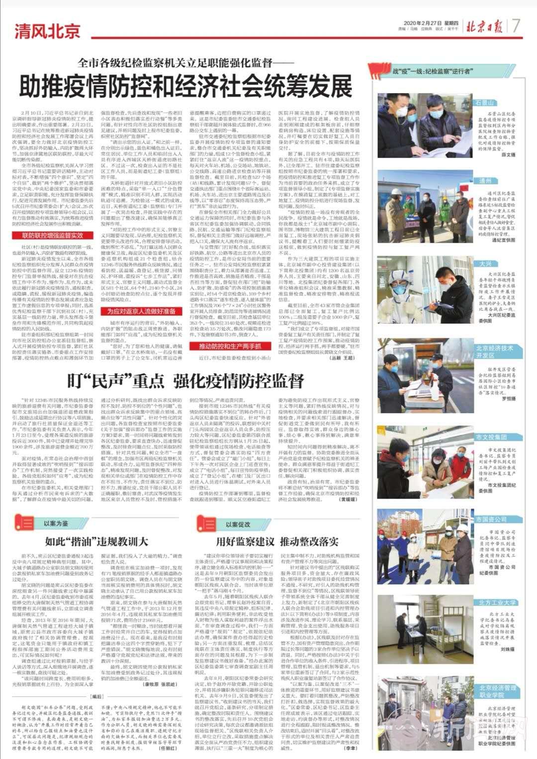 2月27日,《北京日报》刊登beat365纪委书记马春成在学校隔离观察点对疫情防控措施落实情况开展监督检查的照片。同一天,市纪委官方网站“北京纪检监察网”及微信平台“清风北京”推送了“北京多级联动监督,筑牢高校安全屏障”的消息,介绍了beat365纪委监督检查校内家属区疫情防控工作的情况。目前,这两条报道均被推荐至“今日头条”、“学习强国”平台。学校纪委不仅代表高校,也作为北京纪检工作的典型受到了广泛关注,展现了beat365疫情防控专项监督工作的良好风貌。
