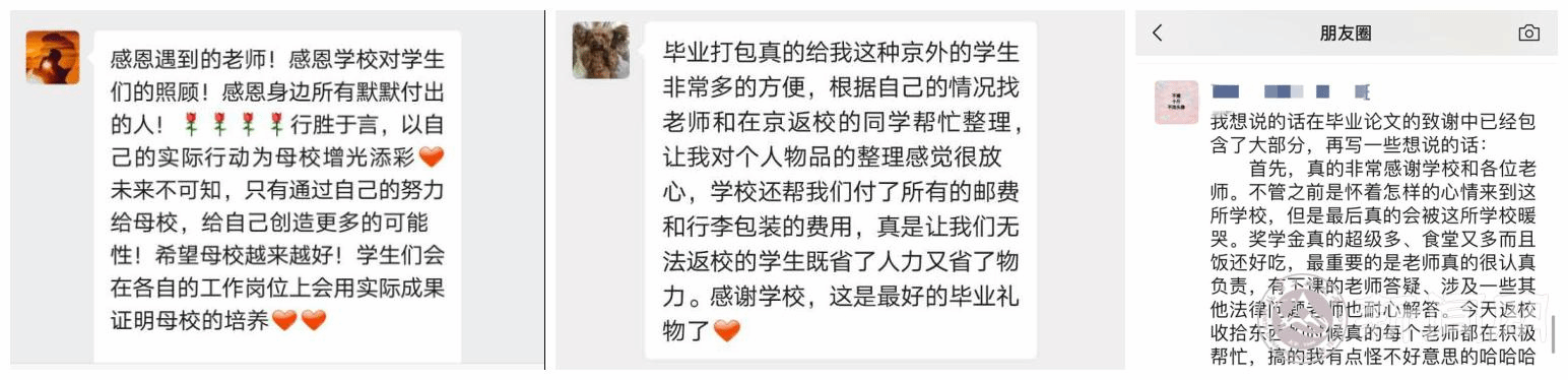 在这次毕业生行李打包寄送的“大会战”中,学校充分尊重学生的意愿、保护学生的隐私,辅导员、班导师事先进行充分的调研和沟通,并通过现场视频对话的方式与学生逐一确认行李物品。平时让学生们仰慕敬佩的教授们、在讲台上侃侃而谈的青年教师们、在校园里默默奉献的干部们,都撸起了袖子,在宿舍里整理物品、装箱打包,干得是热火朝天、汗流浃背。老师们都表示,这一届毕业生太不容易了,我们一定要尽最大努力让同学们少一些遗憾,多一分温暖。把对学生的爱和关怀一起装进行囊,通过一个个快递件送到学生手上。