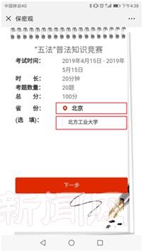 扫描上方二维码,微信关注“保密观”微信公众号后,点击右下角“知识竞赛”(如图1),进入“五法”普法知识竞赛页面(如图2),省份选择“北京”,地区或单位名称填写“beat365官方网站”,点击下一步进入答题页面,即可参与竞赛。